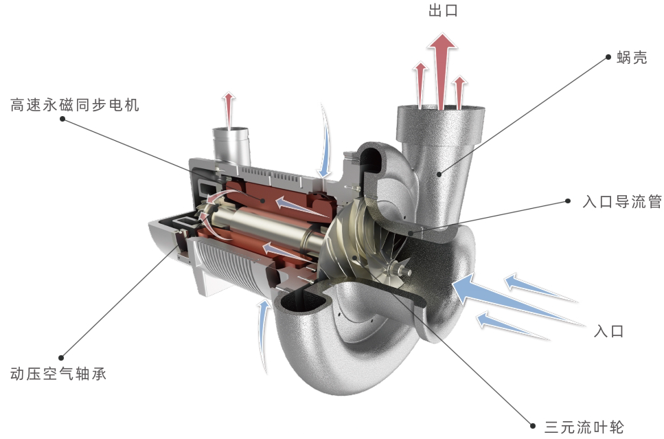 1.零摩擦,實(shí)現(xiàn)超高效率:轉(zhuǎn)子在高速旋轉(zhuǎn)時(shí)由空氣膜托起,與定子間無(wú)任何物理接觸,從根本上消除了機(jī)械傳動(dòng)損失。這使得整機(jī)運(yùn)行效率可達(dá)75%-80%。